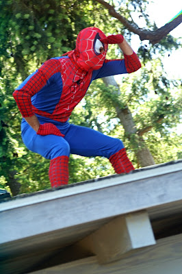 And here is where the Spider-Man obsession all began. At Truman's 3rd birthday party last summer at Keats. Spider-Man (a.k.a Sean) made an appearance on the roof of their cabin, did some killer moves that only Spidie can, gave the kids a high five and a box of smarties and disappeared with one last leap (and a pulled groin).