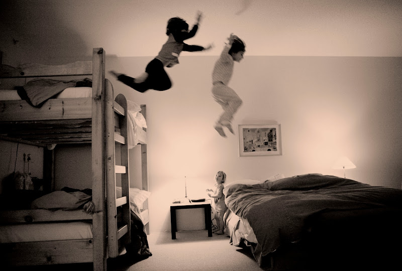So, the first new addition is a bunk bed for my boys (currently in pieces in the garage). They are going to shack up together and Clara is going to move back in to Will's room. Sam is as excited to sleep on the top bunk as he was about Christmas. Hopefully there will be no trips to Emergency. Sam seems to think a bunk bed is a launching pad (see below):